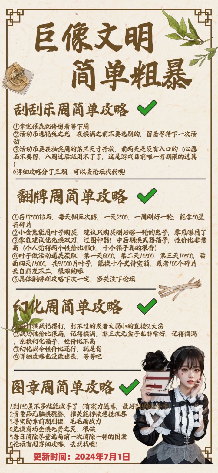 更新日期📆(2024年11月9日,调整了毕业装备图,其余没有变化,很多人都在问活动材料能不能保存,这边统一做一下回的,能!。基本上所有的攻略我都做好了,需要查询什么只要搜索关键词就可以,全是保姆攻略,看不懂群里艾特我就行。群号:783848511)5/30更新:超级大Tips:100关后别扫荡了,每天少两百万金币和五百钻,直接点开始再跳过!!过了101关后,等级大概满了,推关可以佛系推,越慢越好