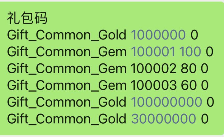 礼包码Gift_Common_Gold 1000000 0Gift_Common_Gem 100001 100 0Gift_Common_Gem 100002 80 0Gift_Common_Gem 100003 60 0Gift_Common_Gold 100000000 0Gift_Common_Gold 30000000 0