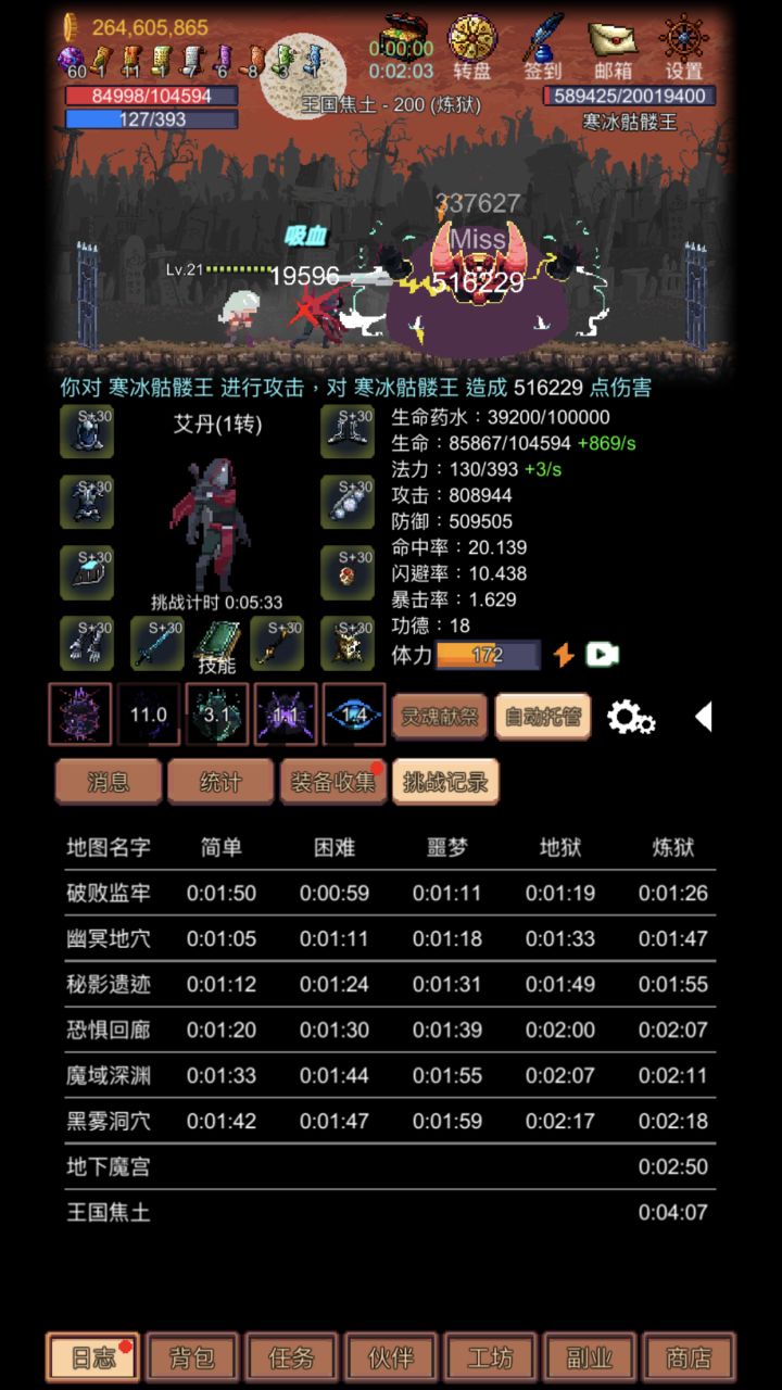 目前现阶段的装备属性,能够打过300万血的骷髅王,现在就是不转生打点小钱和被动技能书。现在也给一点自己的体会。这个游戏就是和宝箱猎人很像,装备靠开箱子。想推图,只要是你开箱子限制难度下的最高阶的装备强化个几级就能过了,镶嵌的话,前期推荐体力和力量,少部分的敏捷,中期就是敏捷加体力了。因为敏捷加命中和闪避,体力加血量和防御,攻击力就靠装备,至于其他属性,智力是加法力上线,精神我猜测应该是加暴击。由于