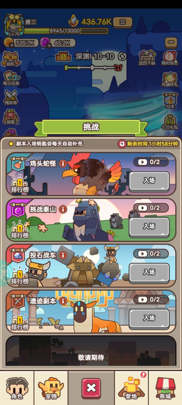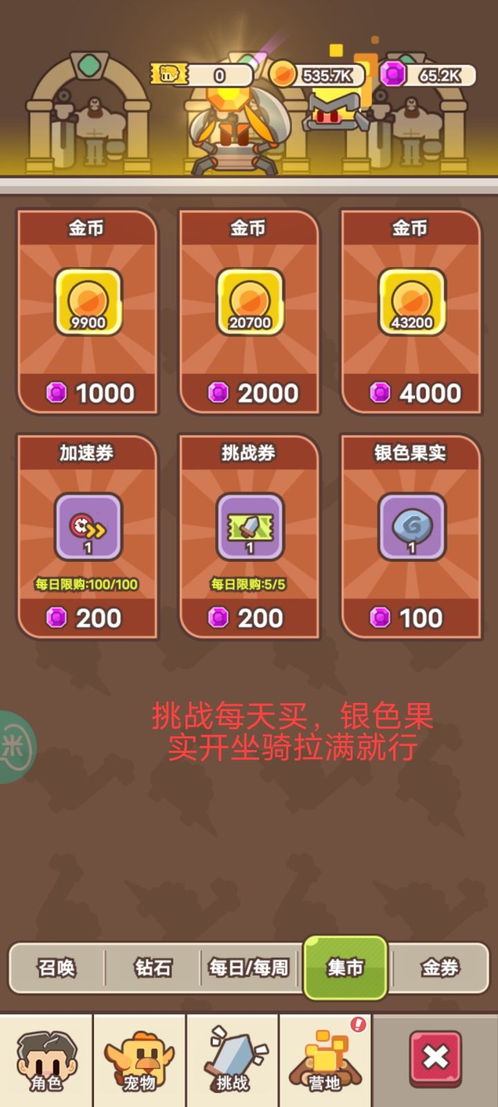 #攻略投稿#来个攻略吧。主要是为了让新玩家们少走错路,资源尽量合理利用。现在游戏才开区第4天,现在玩法不算太多,而且这游戏也不算太肝,肝帝发挥不出太大作用。这里先提一嘴,当前版本,坐骑为王。砖石都留着。商店里面花砖石买的暂时就竞技次数。其他都可以不用买,技能和宠物能上6级就行了。每天送的资源很多,能偷资源就偷资源。鸡腿=经验+装备(靠欧气)。坐骑:现在还是加成很离谱,主要玩法,5.6.7都
