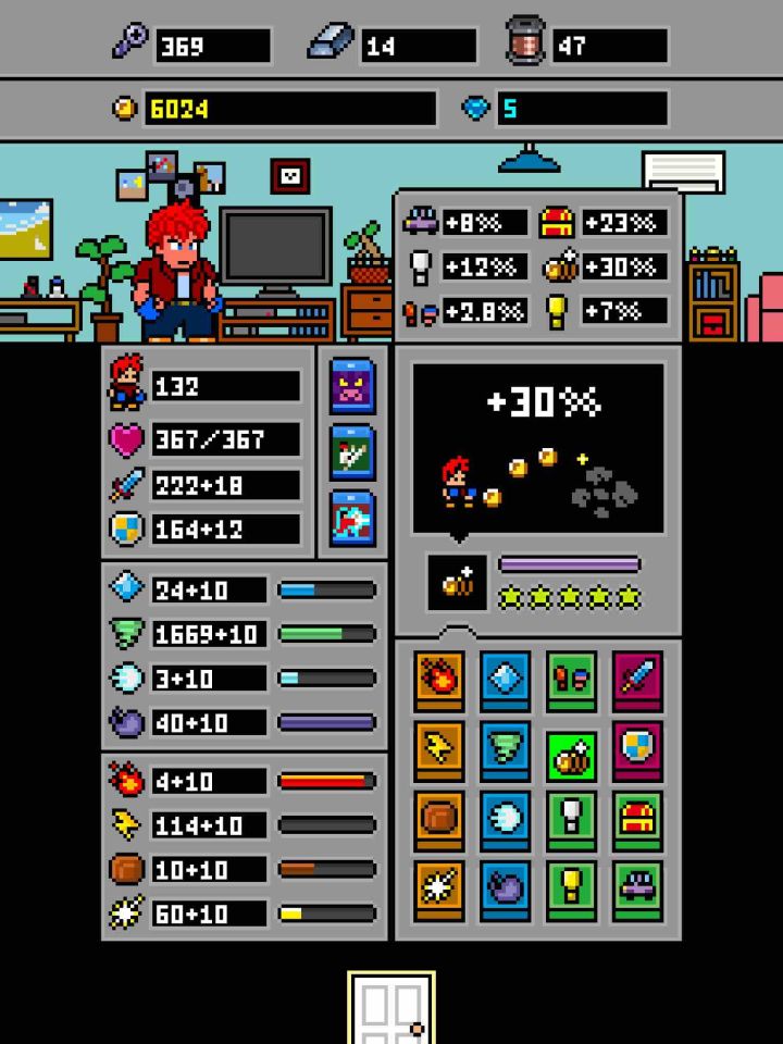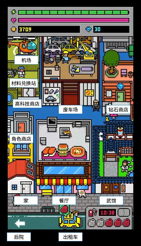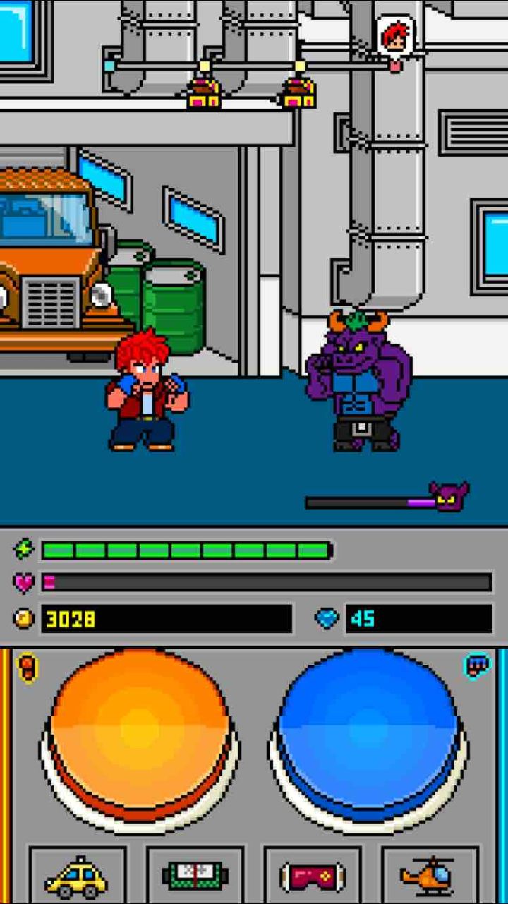 此游戏主打像素休闲风,成长机制不会让你卡关太久,虽然战斗只用两个操控按键,但不同的按键组合出不同的招式,每个怪物对每个招式都有不同的抗性。游戏主要为推图赞金币买技能物品,被怪打死后回家吃东西还能涨经验,每级大概能+2的攻防。进图一次费一个邮箱,每10分钟恢复一个,肝的玩家可以试试改时间大法,游戏全程可以不联网,下方左箭头进到后广场,就是设置的菜单,可以把里面的奖励钻石都领了,不过也没啥用。游戏内
