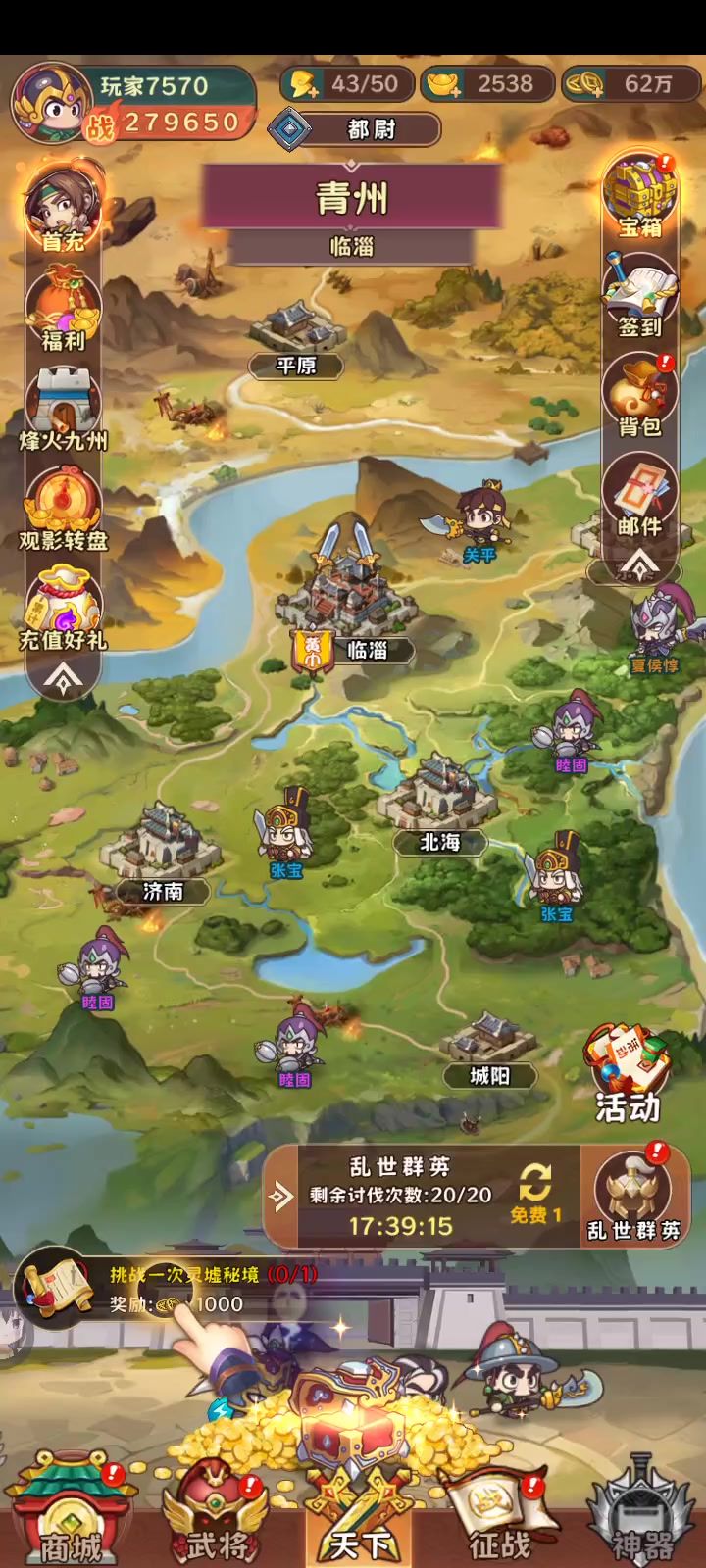 阵容主郭嘉,甄姬,周仓,曹仁。这几个英雄可以说是人人都有的,又好升星,副将防具最少10级,在主c武器满级强化后,副将武器20,防具也可以开始升20,也可以先防具后武器,但是主c武器必须满级。游戏内获得的非武将技能是按照队伍平均攻击计算。装备每10级强化提供额外属性。 开局除了必拿的输出技能,其他技能不考虑,能随机就随机,利用风火轮跟双阵法加武将自己平a打输出,打boss注意走位就行了,开局的小兵