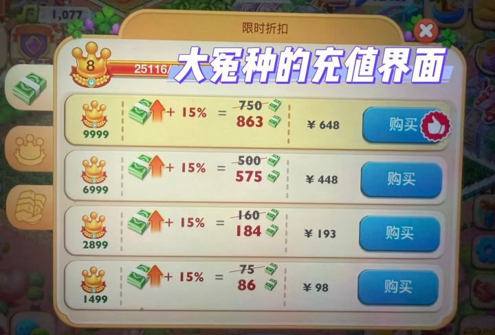 结果,今天推荐朋友和我一起玩才发现我就是那个被杀熟的大冤种。别人的新号旧号充值界面都是百分百比例赠送,我的却是百分之十五。同样的金额充值,我比别人少了高达85%的充值差额,真的好讽刺啊!