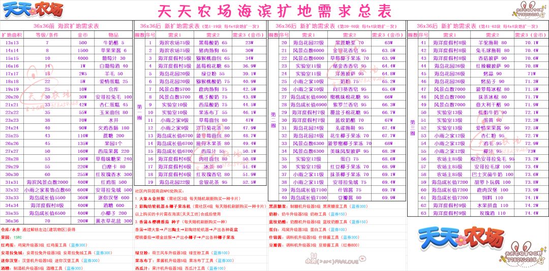 三叶草 30M,奶牛 牧草 1H,利木赞牛 黄瓜 2H,水牛 玉米 4H,鸡 雏菊 6H,黑鸵鸟 燕麦 6H,小鸭子 胡萝卜 8H,安哥拉兔 小麦 8H,绵羊 水稻 14H,孔雀+白火鸡