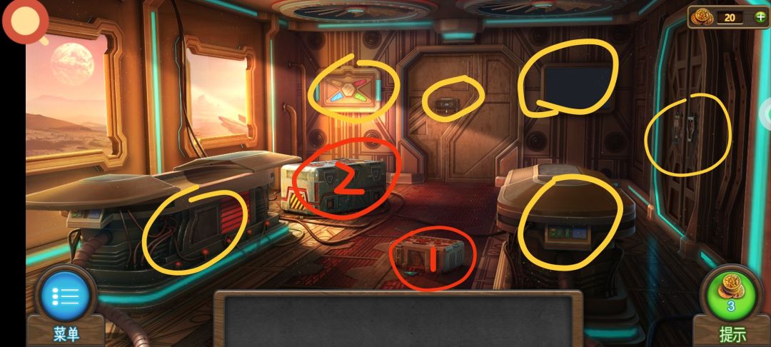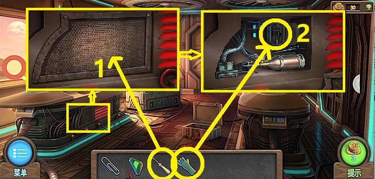 ❶ 红圈1处得到:绿零件1。 红圈2处得到:①碎片,②文件上的别针。 ❷黄圈处点击为后续任务做准备。 绿圈处使用碎片,完成小游戏得到:①橡胶手套,②螺丝刀。(小游戏个人感觉先调54,后786312) ❶绿圈1处 先用螺丝刀,后用橡胶手套,得到:保险丝。 ❷绿圈2处 先用螺丝刀,后用保险丝、别针。 进入小游戏 小游戏完成后进入场景2: ❶红圈1处得到:①绿零件2,②蓝零件1。 红圈2处得到:①绿