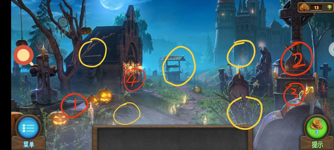 {墓地南瓜头} 右中得到【斧子】 右中墓碑子场景得到【头骨雕像1/2】 中下偏右荆棘子场景,使用【斧子】,查看说明,得到【头骨雕像2/2】 左下地板子场景得到【骨头1/5】,使用【斧子】得到【银币1/5】 中偏右上城门子场景,放大,使用【头骨雕像】 《计数排列,一排2,二排3,三排4,四排2,五排4》 进入城堡 {城堡内吸血鬼像} 中下偏左桌子子场景得到【油瓶】,打开包,得到【净化器】【酸液】 中