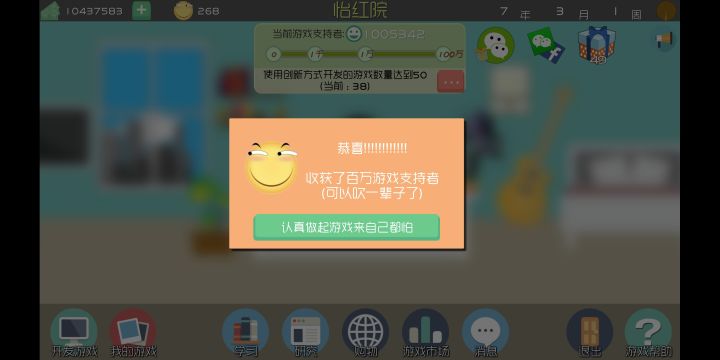 这款游戏真的很好玩!接下来我会用自己的风格,讲讲自己的感受和技巧。呜呜呜T. T玩了两天,游戏出bug了,我还想着来个大圆满的。这游戏告诉我学习学习学习学习学习学习和美术功底真的很重要!!!游戏类型和市场调查算什么?啊?(╯‵□′)╯︵┴─┴什么都不是,不能当饭吃╮(︶﹏︶)╭美术大触能解决很多问题啊!(选择会程序的美术,前期交了房租还有钱,一直学美术钱还来得快!)你知道策划有多努力