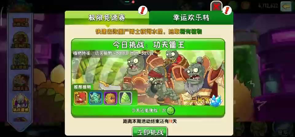 这周的挑战是超能花菜,我只能说打得真累,五阶花菜都过不了。 周宝箱一共三个。主线打僵尸,活跃150,植物挑战,这三个宝箱其实是一样。完成任务开宝箱之后,点星系返回登录界面,选云端登录覆盖掉本地,这样宝箱就可以继续领了。(以前可以这样一直刷碎片,现在宝箱数被锁定了)这样开宝箱,就可以直接把这周的金宝箱领完了,也就是3个,之后再刷就数据错误了。 这样就相对应跳过植物挑战,直接把宝箱领了,需要注意,领完