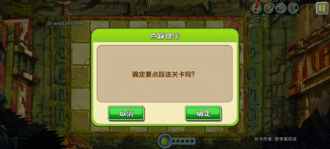 首先找到一个没有被点过赞也没有被点过踩的关卡(建议自己做一个),点进去后等待30秒,然后点击左上角的踩,就会出现这个界面 出现这个界面后点击“确定” 紧接着再点击下图圈出来的“×”(不要点“确定”) 点完“x”后你就会发现,图一所示的界面是还是在的,所以接下来只需要重复以上步骤50次就可以了[表情_送花][表情_送花][表情_送花]
