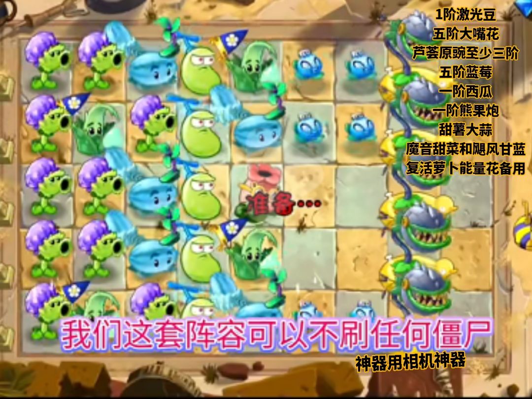 按视频摆好,然后开始摆五棵能量花拿豆,刷到最后用大蒜和甜薯把僵尸赶到三路趁甜薯没被砸拍照,接着铲掉甜薯,用魔甘,然后那秒用相机神器复原,到了下一局先拍照再把大蒜和甜薯铲掉,等到最后一波用相机把甜薯和大蒜放出来,趁无敌状态给大蒜甜薯开大,然后用魔甘,建议相机神器升到三阶