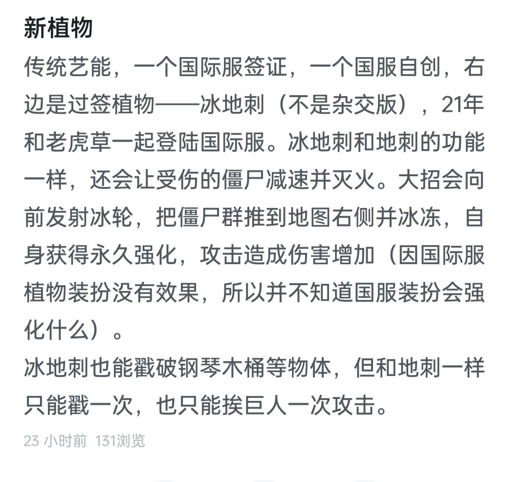 中文版下次过签的植物是冰地刺,上次简单给大家介绍了一下,结果官方动态和演示很明显把冰刺加强了 中文版冰地刺跟钢地刺一样,能承受三次致命伤害(冰刺),大招会先把僵尸聚集起来然后再发射冰轮,额外获得一根冰刺,且这根刺存在时伤害增加,装扮大招则是会在上下三行发射冰轮 五阶攻击范围会扩大,概率冰冻僵尸,损失冰刺时触发爆炸,造成伤害并冰冻致伤来源,并使周围僵尸减速
