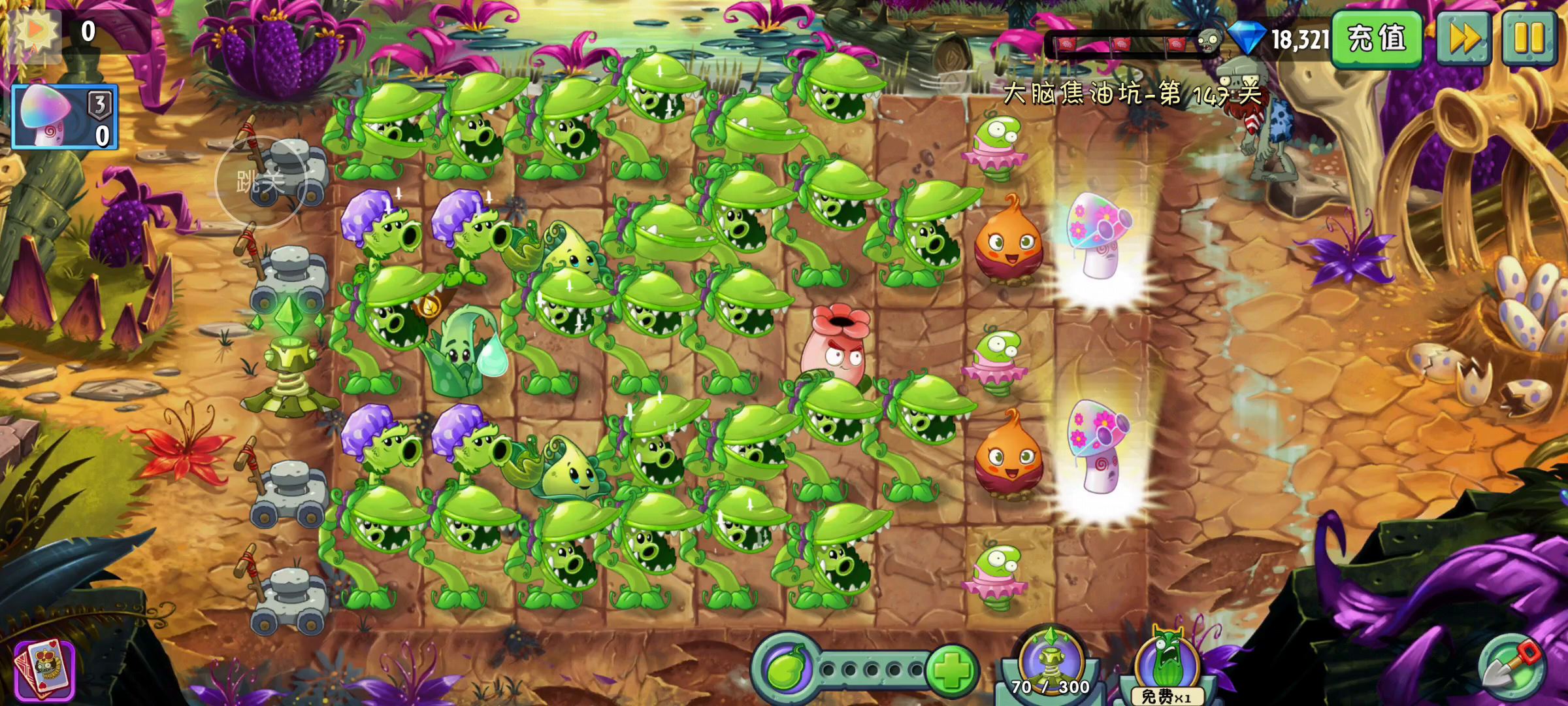 这关有加速瓷砖,要注意有加速词条的僵尸,上半场种一排猴子打就行,用地锯草打掉黄眉的韧性条后用豌豆射手秒了,下半场用火鸡配一排原豌就可以稳过