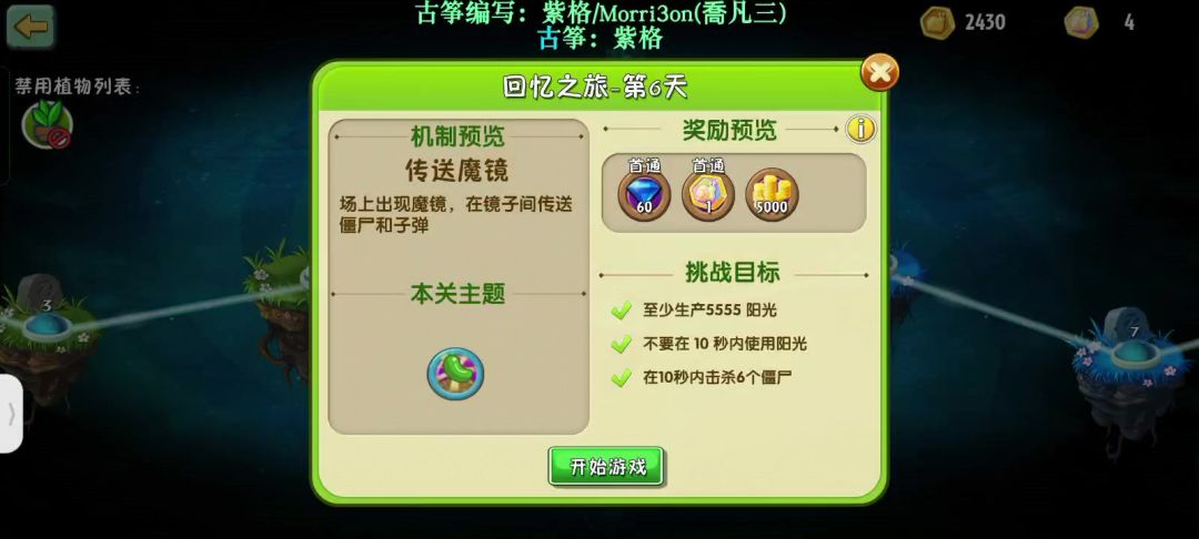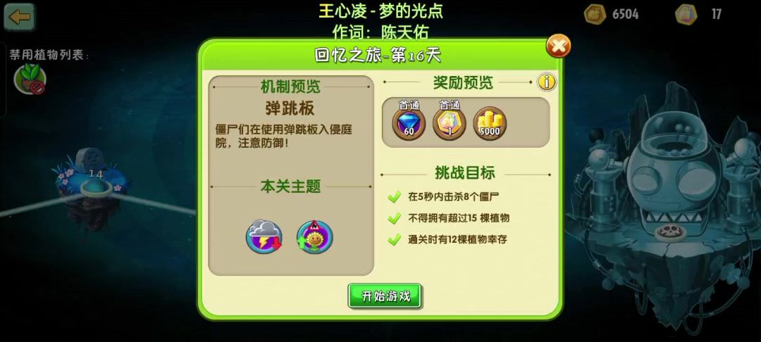 特别鸣谢:昵称是这么起的吗;梦,三年;成为不了陈晓;一度一春秋 第一关思路: 推荐用变身茄子复制大嘴花去打,可以放在第一排吃僵尸,开局用爆裂葡萄即可,最后注意完成幸存任务 视频: 第二关思路:注意开局的迪斯科尽量留住完成任务,后排至少保证有一排仙人掌。 视频: 第三关 思路1:本关前期需要3个葡萄开局,之后背板操作,4,6列会出现辣椒僵尸,在僵尸沙尘暴过去的时候用治愈神器挡反弹子弹,最后记住一定要