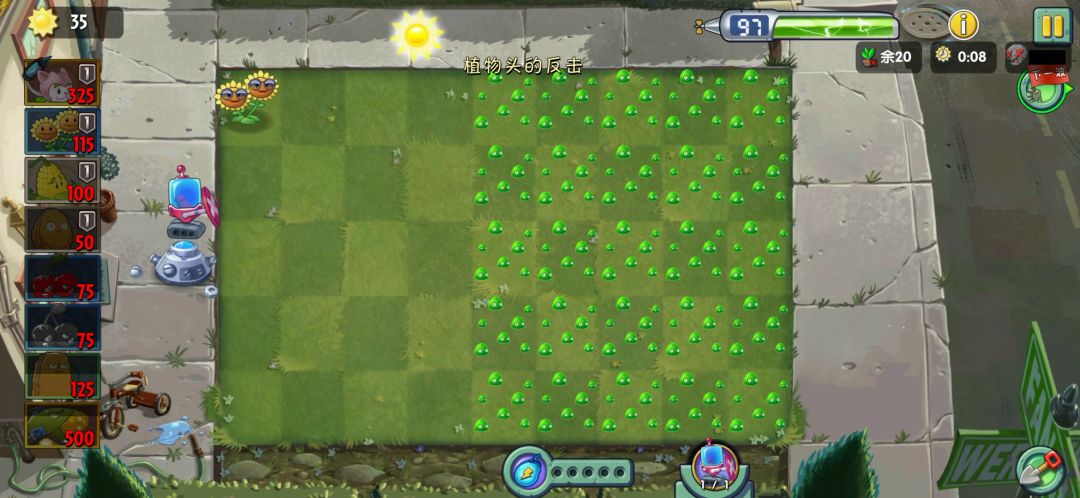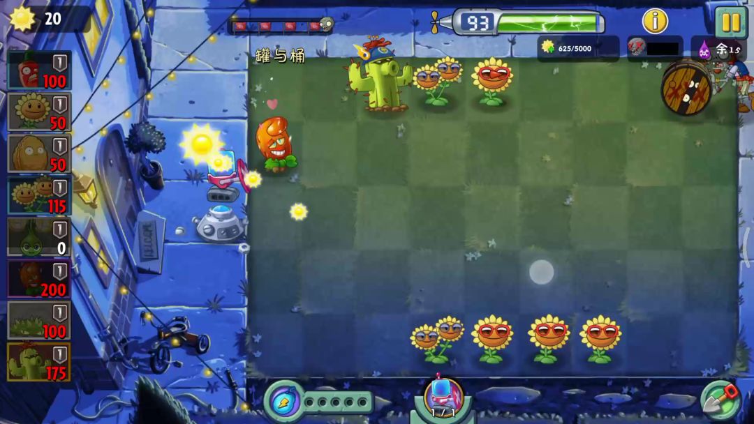 可以把南瓜换成路灯花以防有盗贼进入隐身后无法击杀,这关精英Boss是闪电枪,只管猫尾输出即可,有豆后给豆仙人掌快速过波