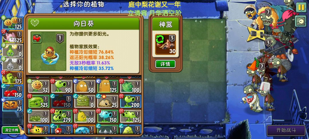 本攻略主要面向想在本赛季完成回忆之旅光辉岁月成就的玩家,已完成的玩家可以不看 植物:卡组如视频中 神器:投罐(等级不限) 家族&基因&挂件: 双向:生产速度增加16.76%,种植冷却缩减54.89%,聚光(橙色)花盆 猫尾:阳光消耗降低24,攻击力增加26.53%(非必要,有攻击力增加即可,不要闪电伤害增加),1级基因(非必要),0级牛仔手套(蓝肥及以上皆可) 机枪豌豆:攻击力增加23.87%(非