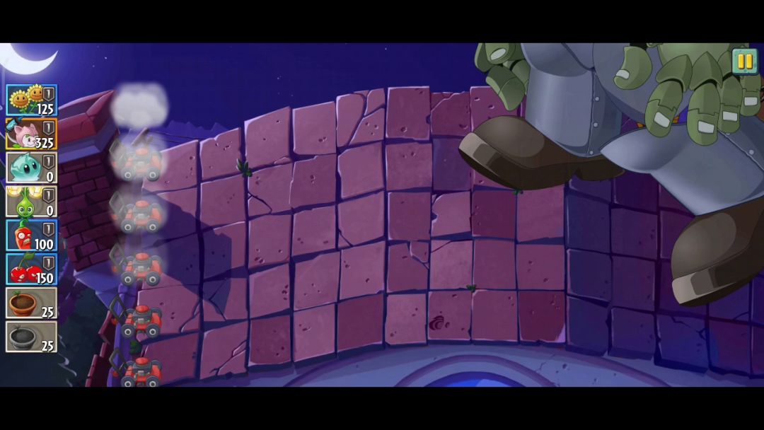 注意:1.困难的无畏号放的僵尸从开始到结束皆为3阶。3格-4格血时只会放普僵,路障,铁桶和小鬼;2格-3格血时会增加大爷,防爆警察,气球僵尸和巨人僵尸,低于2格会增加迪斯科3000,机甲巨人,和全明星 2.无畏号攻击手段共三种,其一扔废弃车辆砸2×3范围的植物(前四行范围),其二踩一脚2×2范围(六、七列),其三吐冰球或火球(冰球辣椒解,火球生菜解)(技能有前摇,血越高前摇时间越长,吐完后还有一小