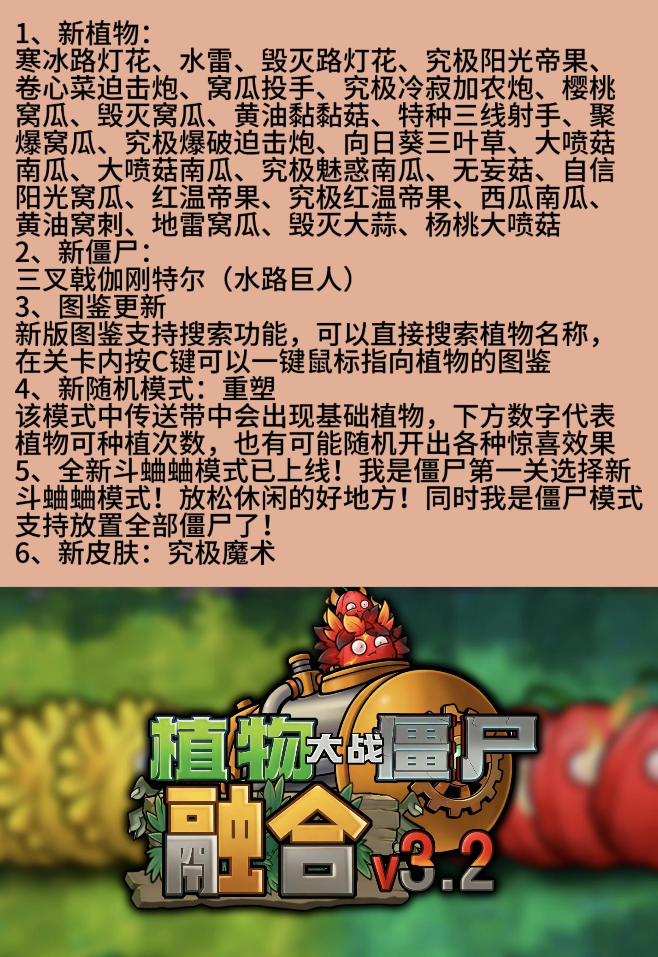 1、新植物:寒冰路灯花、水雷、毁灭路灯花、究极阳光帝果、卷心菜迫击炮、窝瓜投手、究极冷寂加农炮、樱桃窝瓜、毁灭窝瓜、黄油黏黏菇、特种三线射手、聚爆窝瓜、究极爆破迫击炮、向日葵三叶草、大喷菇南瓜、大喷菇南瓜、究极魅惑南瓜、无妄菇、自信阳光窝瓜、红温帝果、究极红温帝果、西瓜南瓜、黄油窝刺、地雷窝瓜、毁灭大蒜、杨桃大喷菇2、新僵尸:三叉戟伽刚特尔(水路巨人)3、图鉴更新新版图鉴支持搜索功能,可