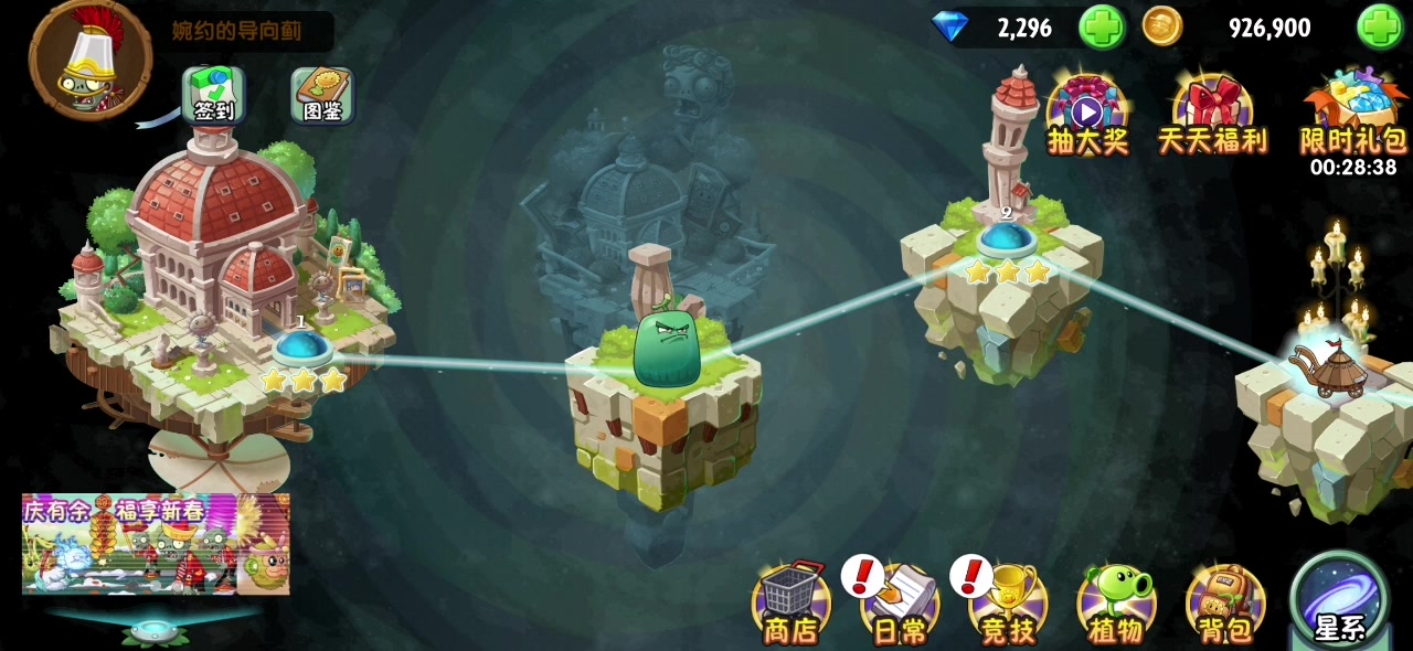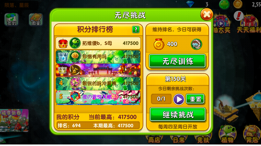 植物挂件可以给全息坚果和高坚果带万能医药箱挂件,桔梗带金肥料(原本想带减少休息时间的挂件,但它带不了。),神器选用投罐。 开局植物摆成我图一那样(桔梗全部拖到第三行,因为第三行好像不会出投篮僵尸),然后种向日葵铲掉刷种子。之后用投罐赌豆,刷不出豆和刷到巨人就重开,有豆后在第一波旗帜前给高坚果前面的全息坚果喂豆,然后注意小丑(只会第三行出,他进场后优先炸死),蹦极划矿车躲避偷植物,盗贼进场就炸死。小