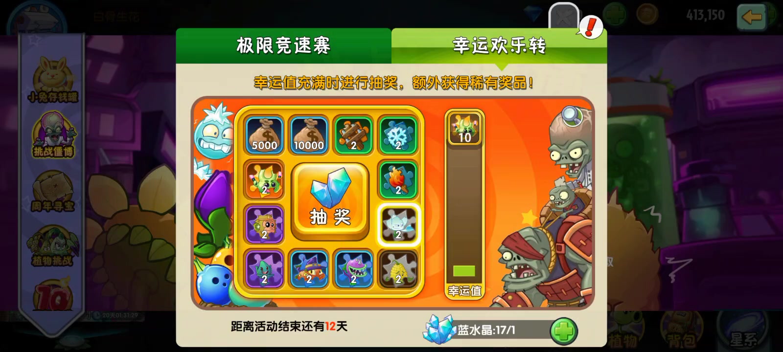 开局快速种两向日葵在二、四行嫖一百阳光,然后保着三路的向日葵打,每隔约20秒产一次阳光拖160秒即可 再讲些小细节: 1.开局第四行的两个普僵先不要打,等后面的🐔出来后一起打节约🎈 2.小丑,跑酷和隐身击杀优先级最高,第一行的僵尸优先级其次,二三四五行不用太急 3.前两列可种两排🎈防跑酷偷家 4.🐔贼出来后在其相邻两行及其所在行各摆一个全息,等四🎈都好后一个杀🐔贼,剩下三个等🐔出完后一🎈杀一行的🐔