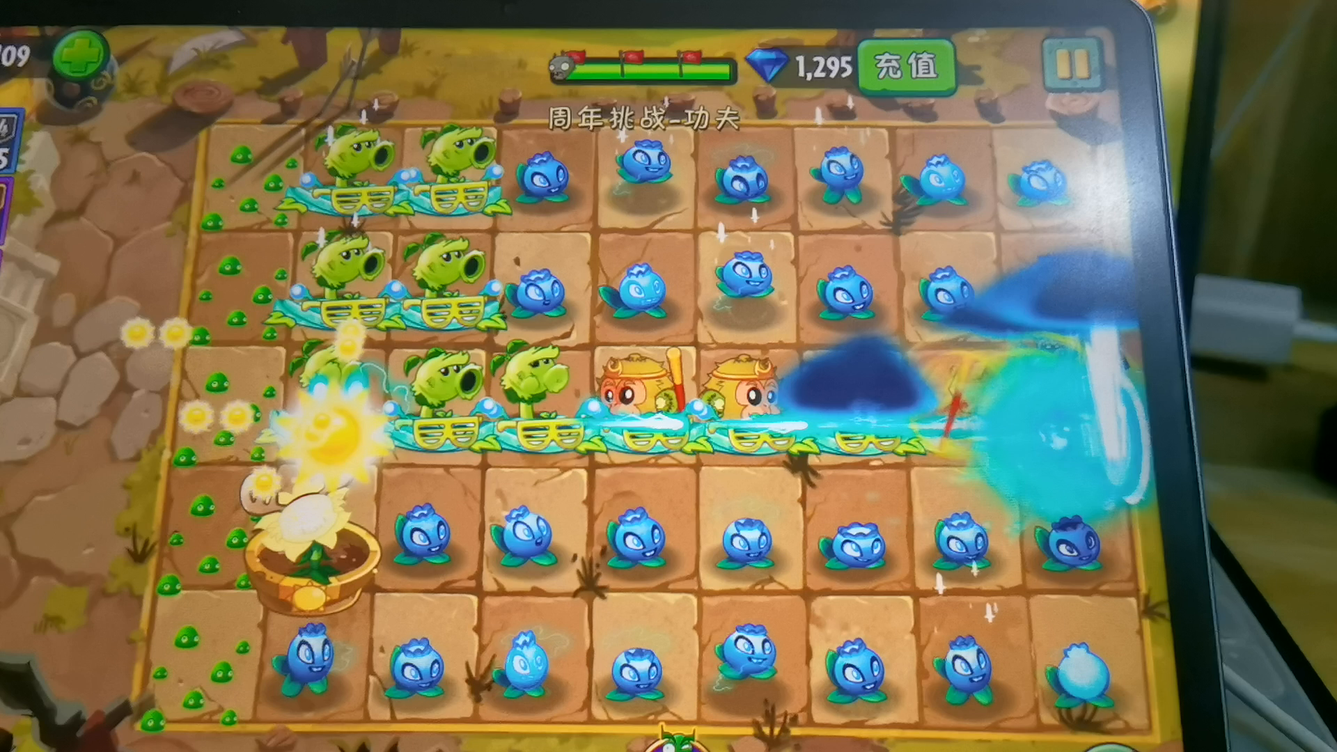 经过多次重打,这关出怪的位置是固定的,可以参考一下 双蓓蕾种第三列节约空间,双向直接可以开头第四行第九列种挡住迪斯科(迪斯科此时被判定为在场外不会召唤飞行僵尸),然后按照第三行第九列→第二行第九列→第一行/第五行第九列的顺序依次种并套上🎃即可,被全明星撞后及时补种🎃,种完后在第二列继续种向日葵防止全明星偷家 一共五个豆,生产阳光过3000后开始依次给三豆仙人掌速刷+两豆双向补充阳光最为省时