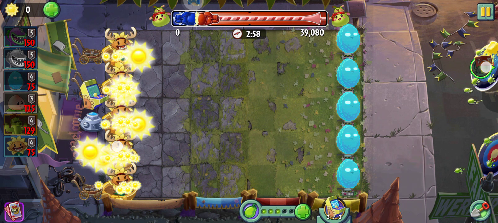 开局还是先整阳光,种好两个冰龙草,这一关多了个魔力护盾,原始豌豆行不通了,上猫尾草了,投罐子僵尸出来之后两个追秒草点掉,最后一波可放置第9列2个冰龙草,直接开大秒杀。 ps:阳光后面很充足,可以多种一列,甚至两列猫尾草。