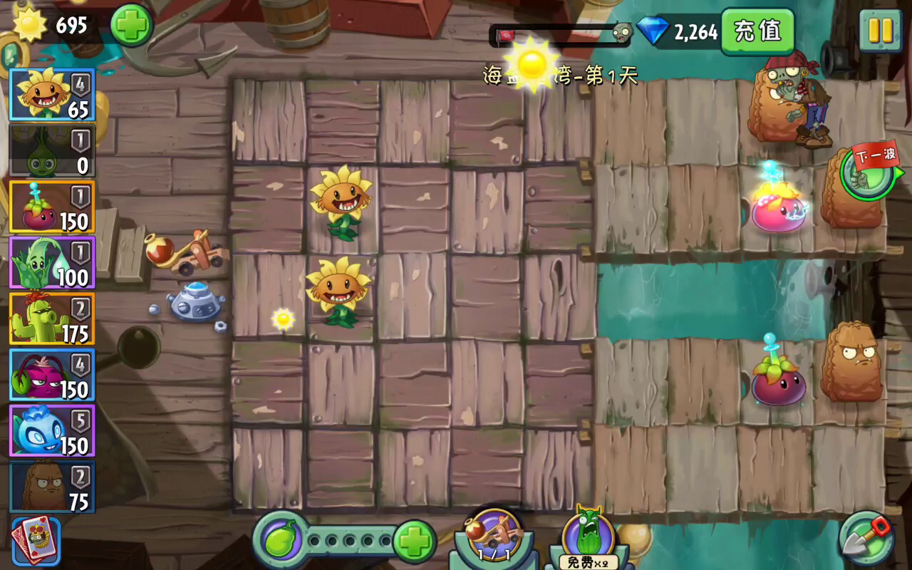 上1列芦藜药师配合棱镜塔神器打boss更简单,开局点下一波出僵尸,在上2路的话给上面的熊果豆,在下3路的话给下面的豆子,剩下的一直给下面的熊果豆子。