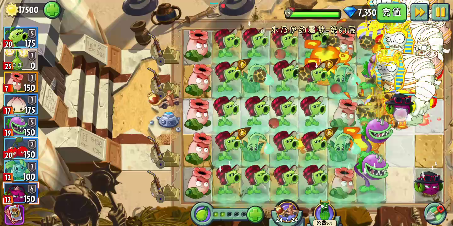 😂😂有好多失误,反正大概就是这样,前期仙人掌给打僵王掉一格血,他低头一次子掉一格,前期节省时间