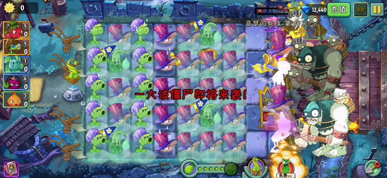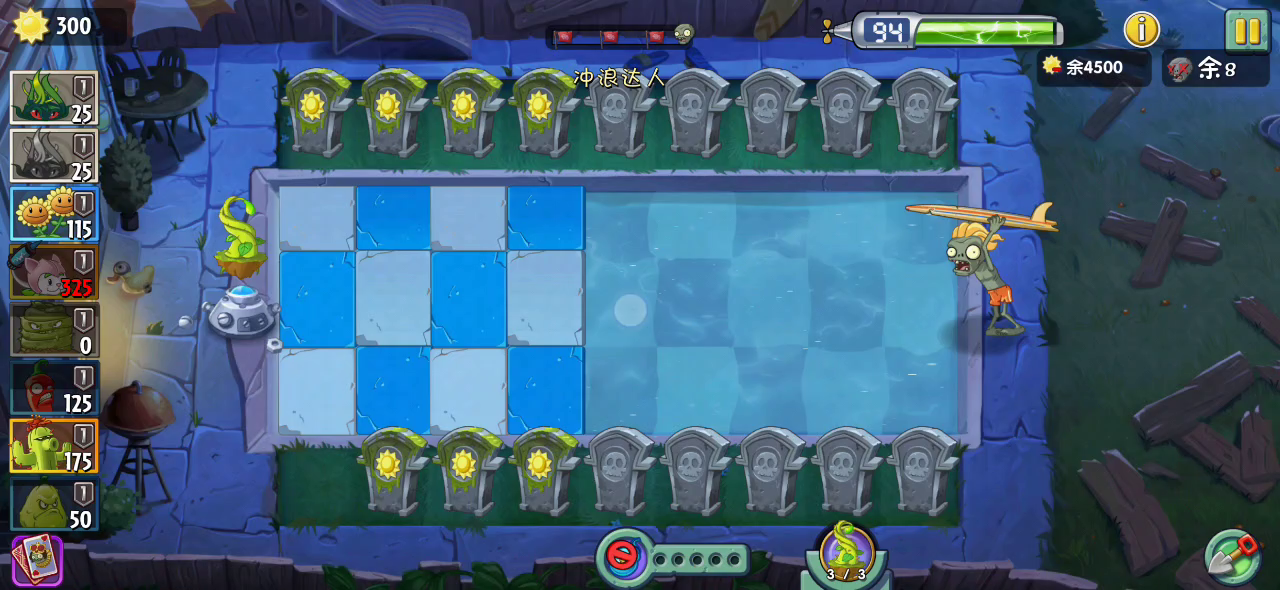 这关很简单,禁神器禁豆都可以过,核心思路是拖,由于水中有毒不太方便种植物,格子比较少,所以建议要卡旗多种产光植物,僵尸上没有什么好讲的