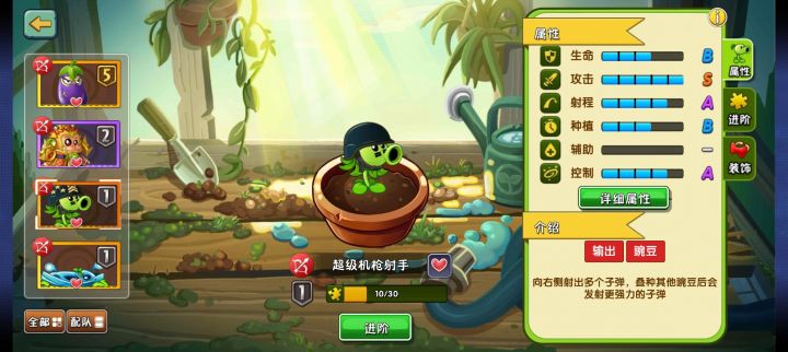 【豌豆荚五阶】豌豆荚在叠种至 5 个后,仍可继续叠种。 再次叠种时,将进化为双重豌豆头。双重形态下再次叠种,可超进化为机枪豌豆头,大幅提升火力输出。此外,2阶、3阶的自动生长效果同样可以触发进化与超进化。