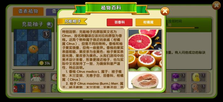 电击钩吻、充能柚子、菜问、竹小弟、胡萝卜导弹车、豌豆射手、向日葵、土豆地雷、莲叶、玉米投手 进阶界面和图鉴均可查看百科,如有遇到红点情况,由于图鉴查看不了未解锁的植物,建议在进阶界面的百科功能点选查看。关于百科功能的体验欢迎在评论区反馈,我们将会提交建议至制作组。 【特别说明】充能柚子的原版英文名为 Citron,按名称翻译应该对应的原型为香橼。这两个物种属于很近的亲戚(柑橘属 Citrus)