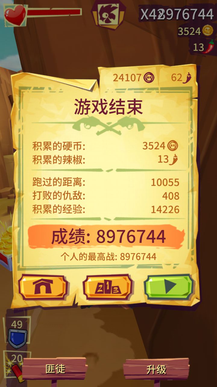 这游戏主人换成追人的那个人,要一边看路一边打牛仔,还要看有没有道具,和辣椒。考验你反应力,否则一不小心就“日”墙或连续吃三颗子弹。虐的不要不要的特别到后期快的不行,炸完隧道后,还不能补点血,눈_눈,炸完速度就特快了。牛仔三个三个的出来给你练手速。最要命的是走山路一条路弯弯曲曲下上坡,一走完就有牛仔在你左右跟本反应不过来。ㄟ(▔,▔)ㄏ