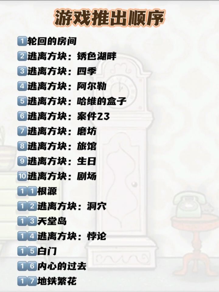 锈湖新作地铁繁花大家都玩了吗? 今天给新入坑的宝宝们带来锈湖的通关顺序,分为游戏的推出顺序和按时间线的顺序。 个人更建议di一次玩可以按推出顺序来,感受下游戏带来的悬念感 然后去阿b看解说(如p 5),理清时间线后再通关一遍#游戏种草计划#游戏安利#锈湖#解谜游戏#攻略#新手攻略