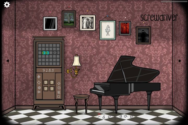 首先去第三个房间,点击男人时说要喝饮料,调按照右上方提示调好饮料给他喝,取得道具螺丝刀去第四个房间,按照第一个房间的提示,以dead face作密码,以房间的提示为参考,在钢琴上输入密码(为了方便输入,大家可以把从红叉当作1,开始输入密码23624613)输入密码后会出现一只手,根据她弹得节奏在左边重复动作(以右边的红叉作起点)随后得到一把钥匙拿到钥匙后去第一个房间开门,得到心脏和杯子,同时
