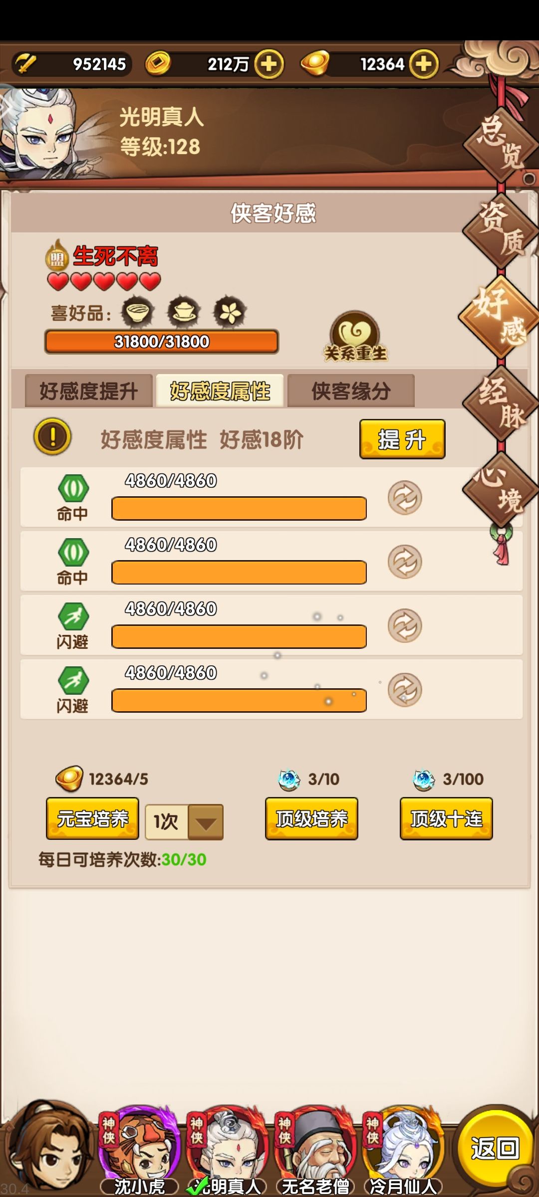 为了更好的让新手理解游戏玩法分享养成心得 游戏前期平民想要每个侠客都拉满不现实,另辟蹊径直接先拉满一个等资源够养第二个了在去培养,先讲优势老王获取难度较低基本人手一个了,攻资是顶级红侠,自带内功是橙血暴,免费神兵加减伤,技能高百分比。 宝石:攻击宝石4颗拉满,闪避宝石一颗(看资源自行整理)把其他侠客的宝石整合起来尽量高等级,商城可以买宝石转换符 好感词条:90级之后可以洗词条选择双闪避尽量拉满珠子