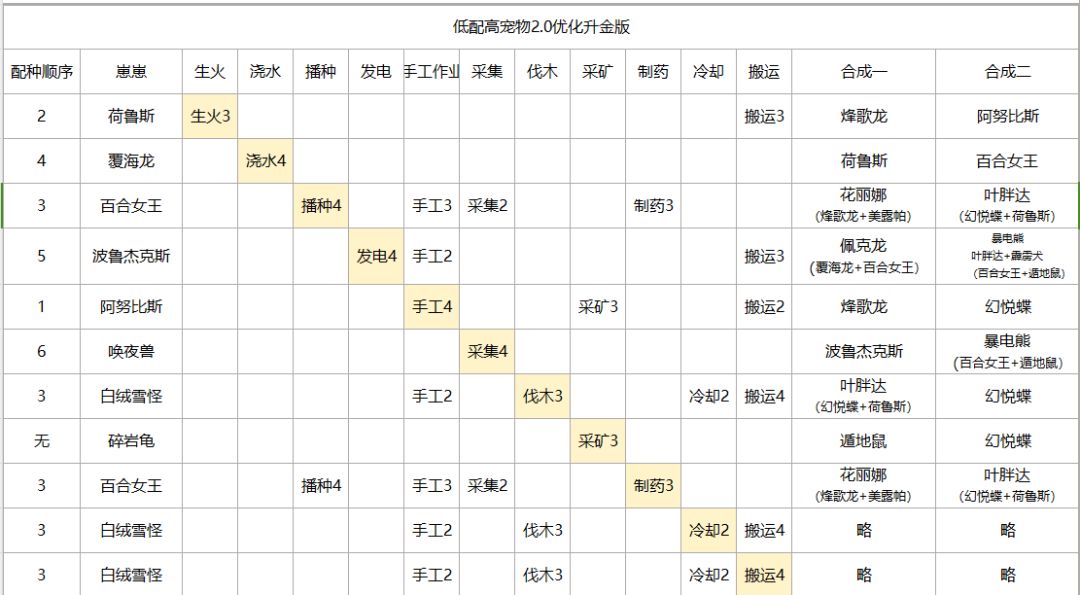 本表核心主旨:除开必须自交的四级火腾炎龙和四级冰唤冬兽(非刚需)、需通过唤冬配得的四级采集唤夜兽(亦非刚需)外,所有毕业打工帕鲁都可以通过只抓四种低级、数量多分布广且在新手出生点旁的帕鲁相互配种、衍生获取 四种必需帕鲁:烽歌龙、幻悦蝶、棉悠悠、美露帕 两种选抓帕鲁:皮皮鸡、绿胖达(可以配出) 本表又名:烽歌龙和幻悦蝶为什么是神 ps.游戏目前伐木、制药最高三级,畜牧只有一级
