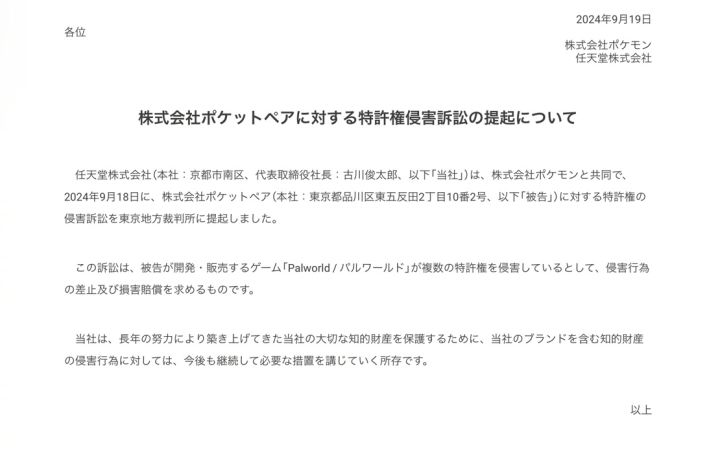 任天堂和宝可梦公司宣布联合起诉《幻兽帕鲁》开发商Pocket Pair,认为后者侵犯了任天堂的多项专利,要求对方停止侵权行为并赔偿。这纸通知中没有提到具体的侵权细节,不过以东半球法务部的战绩而言,震慑力已经足够大了。======更新:Pocket Pair作出回应:将针对侵权索赔启动法律程序和调查,不清楚被指控侵权的专利具体有哪些,不得不将大量时间花在与游戏开发无关的事情上,很遗憾。#幻