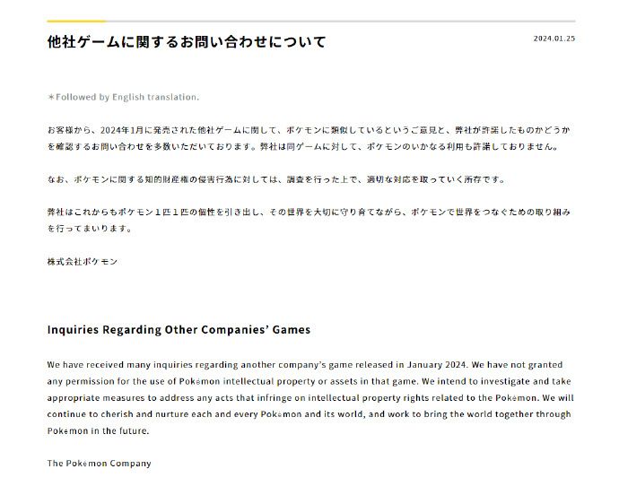 宝可梦公司今日发布了一则公告,表示他们收到了许多有关其他公司在今年1月发售的某款游戏的询问,并确认他们并未授权在该游戏中使用任何宝可梦相关资产。公司将对任何侵犯与宝可梦相关的知识产权的行为展开调查,并采取适当的行动。今后也将继续发挥每个宝可梦的个性,用心保护和培育它们世界的同时,努力用宝可梦连接世界。#帕鲁打工日常#游戏讨论#游戏资讯#幻兽帕鲁#吃瓜爆料#宝可梦