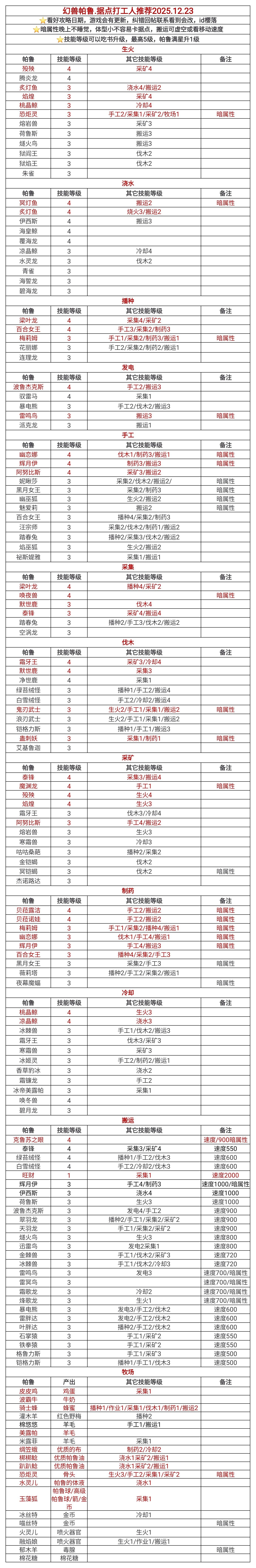 前期帕鲁养成主要是等级、强化和星级。6级解锁的科技【力量石像】可以使用捡到的帕鲁之魂强化帕鲁属性(每次3%,最多30%)14解锁的科技【帕鲁浓缩机】可以用多只同种类帕鲁给目标帕鲁升星,升星可以全面提升属性和伙伴技能,分别需要4、16、32、64共116只狗粮帕鲁,其中一二三星提升较小,三星升四星提升很大(非线性提升的),所以要升星就最好升满。No.1:棉悠悠(酌情留,没必要