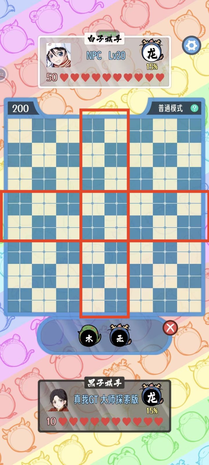 没想到这个游戏还挺好玩的,用来消磨时间挺好的,就是画面可以再美化一下,现在其实看着有点花眼。给大家分享一些必胜的技巧。如图1,我们优先是要将“无”填满中间两行和中间两列(每一行/列只要有一个占在中间就行了,如果被别的棋子抢了,那就用两个“无”占左右),接着检查每一斜排有无遗漏(整个过程都要时刻防止被捡漏),等将所有“无”都排布好之后,就可以猛猛进攻、疯狂输出啦,不用再担心可能突然被反击。如图2
