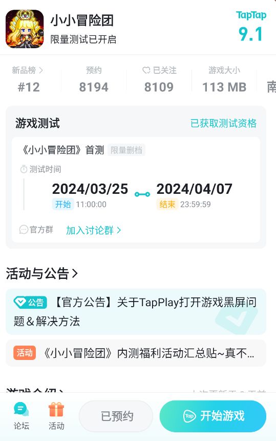 哈喽哇~我是雪梨~,感谢各位冒险者们对我们游戏的关注与支持!在这很激动地告诉大家——我们工作室游戏《小小冒险团》将在2024年3月25日11:00正式开启首轮内测!▌ 测试信息测试时间:2024年3月25日11:00——2024年4月7日23:59测试性质:限量·删档·不计费测试测试平台:安卓(IOS用户再等等,一定会上!!)▌ 测试资格获取(1)TapTap游戏详情页不定时发放资格