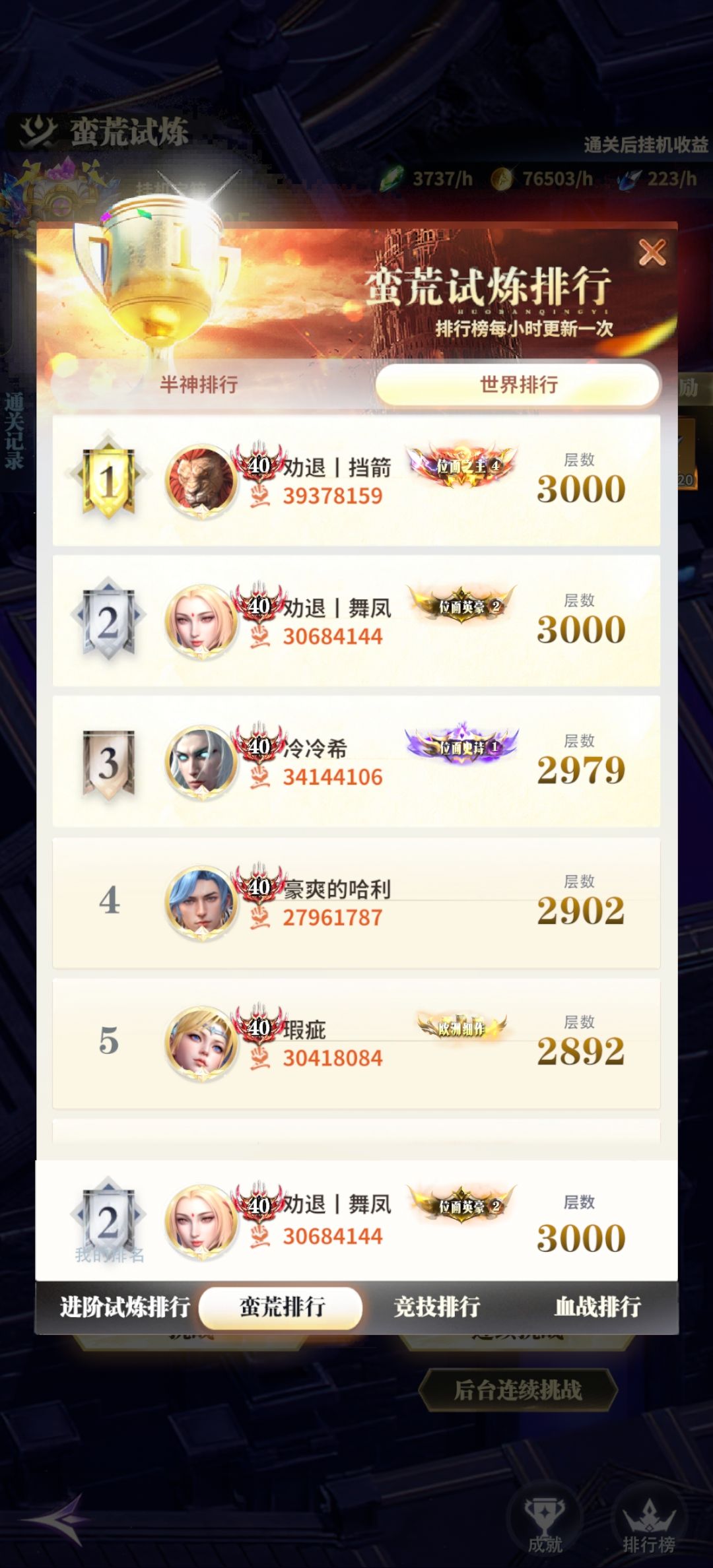 分享下推图心得: 图上就是主力阵容了,狮子 蔷薇 索菲亚 诺诺 色欲特定图可以用,另外索菲亚巨强 这个是3000层无削弱的站位,战力3000w,韧性3.4w,宝石就是传奇没啥用瞎带的,装备,神话,神器都没有拉满。