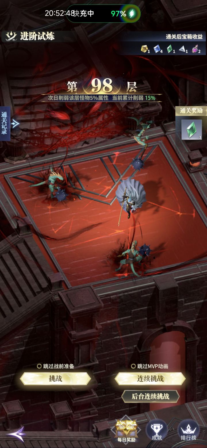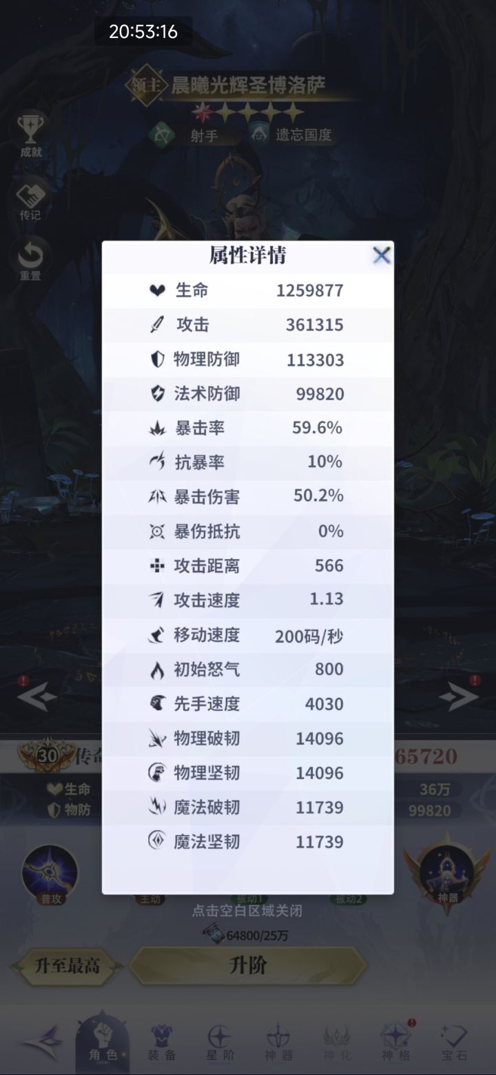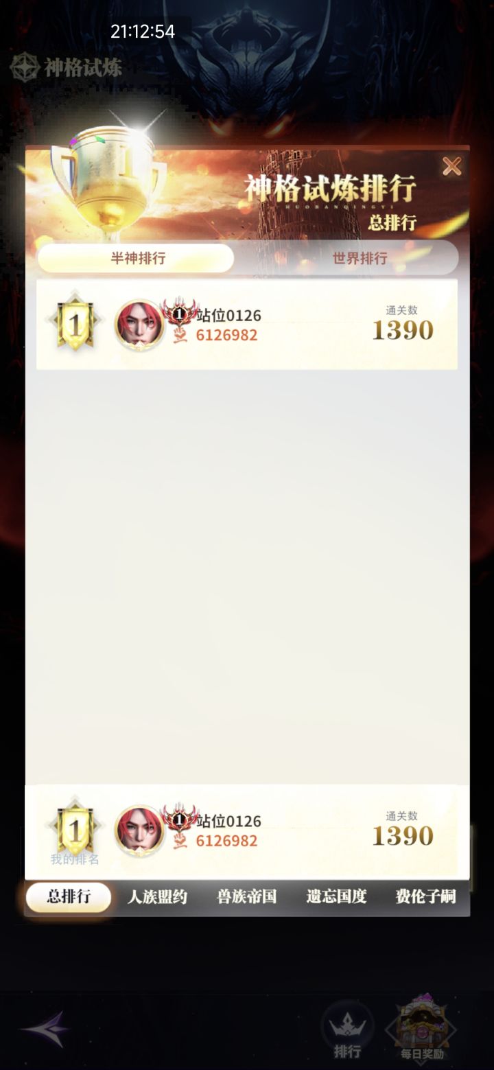 从01.26到04.23,升到半神1一共花费6+28+31+23=88天。蛮荒试炼1623层。进阶试炼97层。神格试炼1390层。伤害刚好可以过半神10阶的世界boss。陈列馆物理破韧14096,魔法破韧11739。