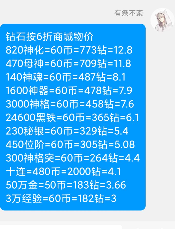 钻石按6折商城物价820神化=60币=773钻=12.8470母神=60币=709钻=11.8140神魂=60币=487钻=8.11600神器=60币=478钻=7.93000神格=60币=458钻=7.624600黑铁=60币=365钻=6.1230秘银=60币=329钻=5.4450位阶=60币=305钻=5.08300神格突=60币=264钻=4.4十连=480币=200