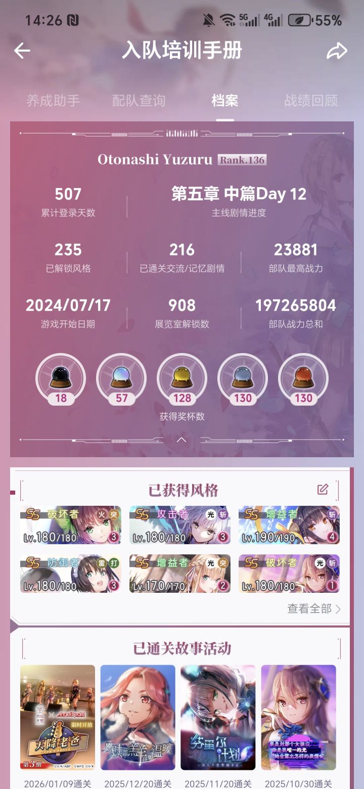 号是国服开服建的,正式玩是25年元旦,作为我接触的第一款不是以音游玩法为主体的二游,红烧起初确实十分上头,2D画风很戳我XP,作为key厨麻子的剧情没得说,尤其是五上,三天打完感觉意犹未尽,红烧确实是我很长一段时间里最喜欢的游戏,有段时间会连凹好几小时高分,但慢慢的,异时层是攒了25张票的,高分是懒得碰的,恒星战是懒得动的,日常是每天五分钟光速下线的,遭遇战是没动过的,压制战限时活动是懒得看的,五中主线也还剩俩天也打不动了,国际服那边不断传来新的强度信息,国服是限定,人权卡连发的,当然国服福利给的真的不错,这真没啥好说的,主要是我自己资源基本挖干净了,一周年的时候还说要玩一辈子红烧,现在看来我会尽量坚持玩下去的,毕竟国际服那边的五下还是蛮期待的,至少还会玩到国服二周年,总之还是坚持下去吧,不像辜负最初的热爱,说了这么多,要有人能看到这,还是希望小登慎重入坑,一进来就跑不掉力,如果不喜欢看剧情也不磕百合,估计会相当坐牢