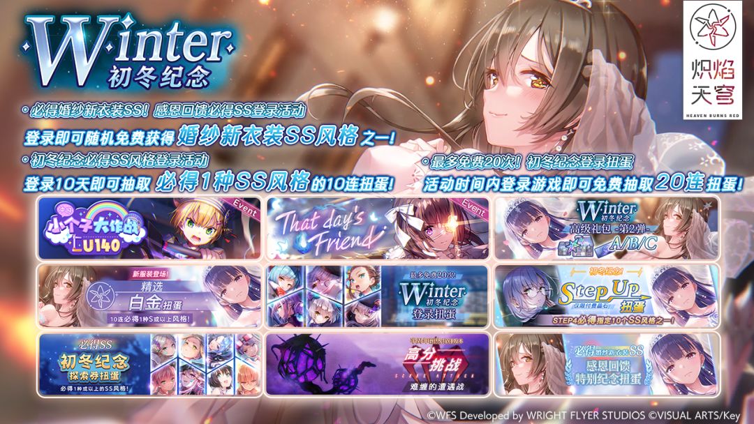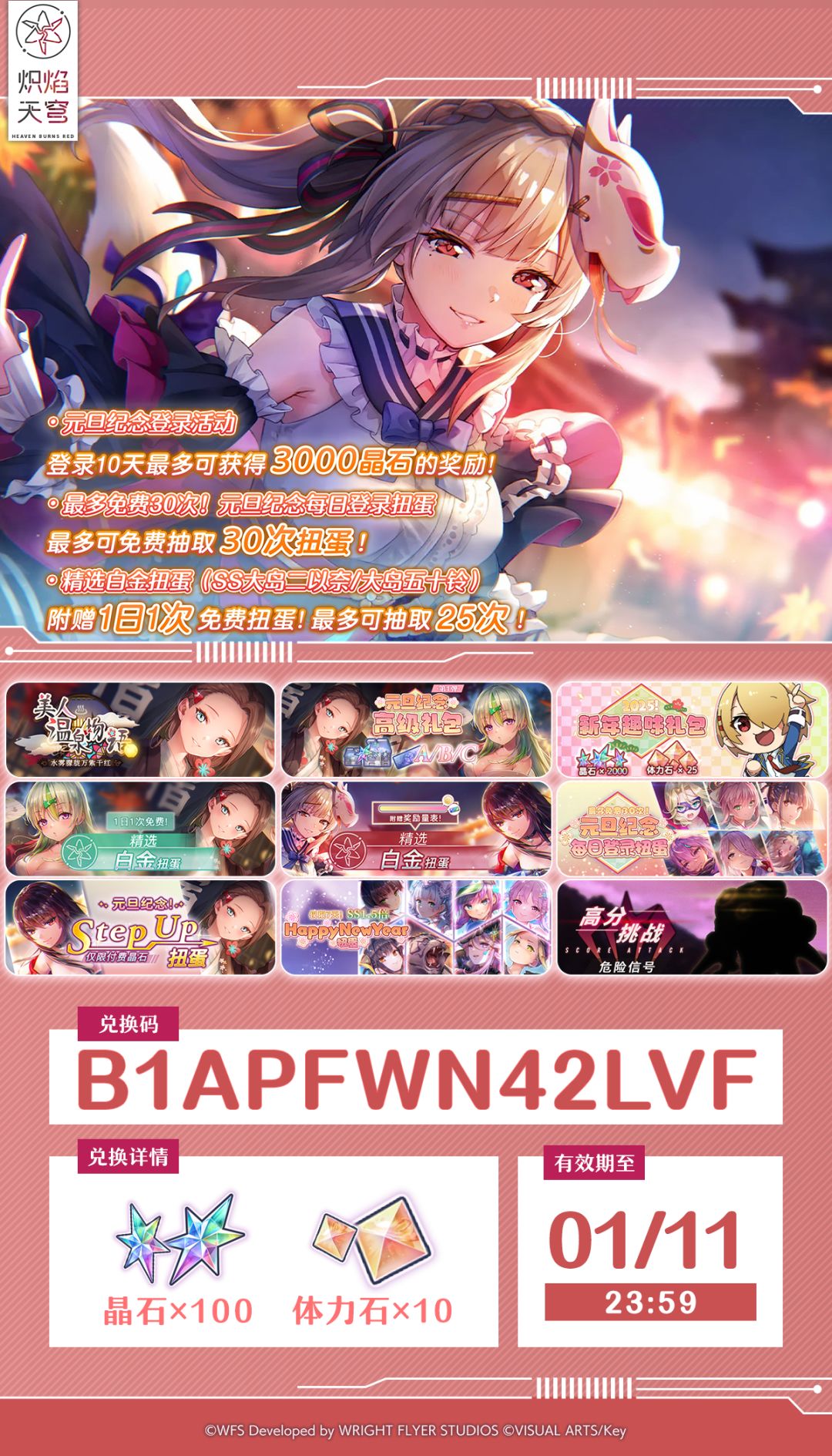 初冬纪念特别活动正在进行中! 登录即得随机婚纱新SS风格,必得SS风格10连扭蛋,免费20连扭蛋等福利活动大放送中! 冬日虽寒,却有《炽焰天穹》相伴~૮꒰˶ฅ́˘ฅ̀˶꒱ა 【高亮!】 周末小礼物送达><希望小礼物可以给大家的周末带来开心能量~ 🎁兑换码:PX1A92V5EVN 🎁兑换内容:晶石×100、体力石×10 ✔有效期:11月30日23:59截止,还请尽快使用~ 📚使用方法:菜单>设定>游