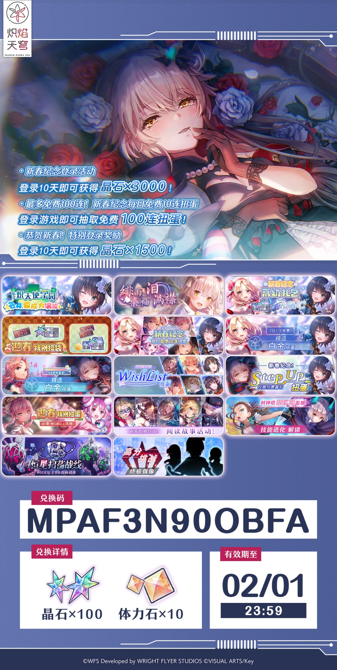 铛铛铛铛!新年的钟声越来越近~ 岁末年初交替时,期待各位新的一年更加精彩纷呈! 新春纪念特别活动现已重磅登场! 登录即送免费135连扭蛋&晶石×7500! 完成任务还能再拿SS风格×1&晶石×4000&必得S或以上探索券×10! 这个春节,就让《炽焰天穹》来陪大家度过吧! ٩(˃̶͈̀௰˂̶͈́)و 【💝赠礼时间】 年前小礼物送达><希望小礼物可以给大家带来开心能量~ 🎁兑换码:MPAF3N90O