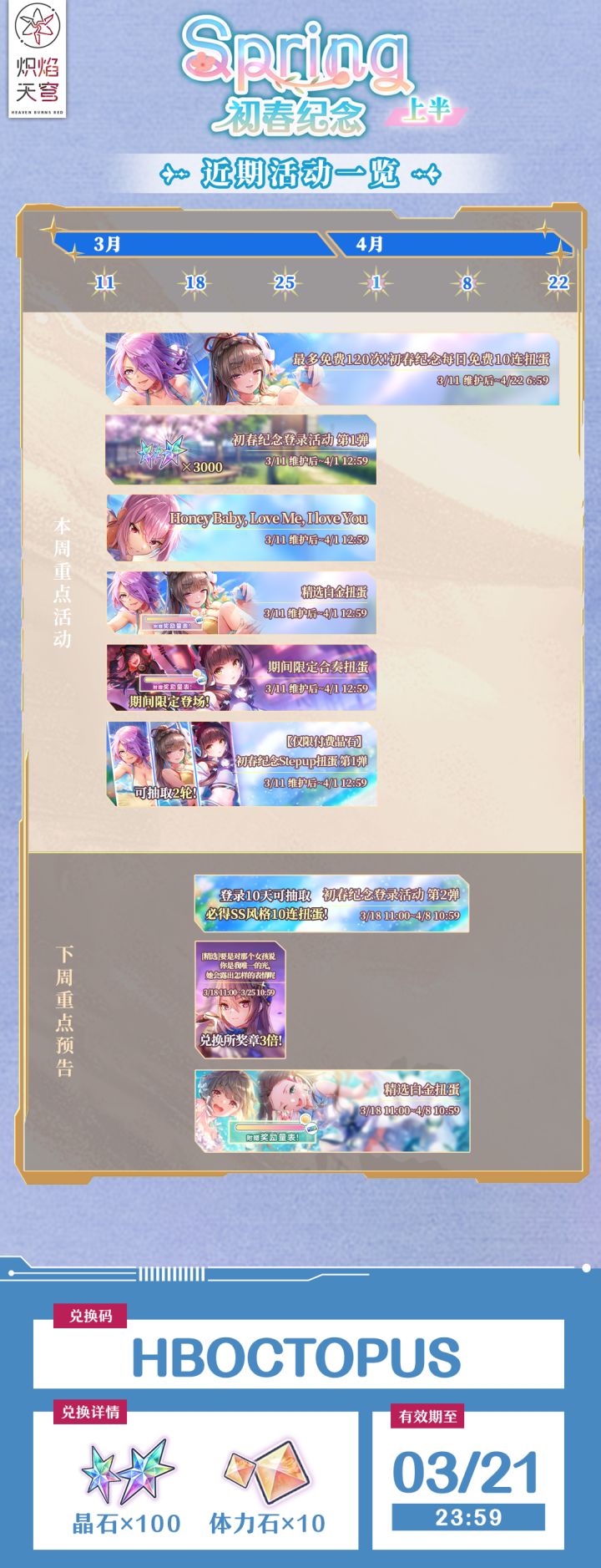 初春纪念版本活动已开启,全新主题活动及限时扭蛋举办中!期间限定合奏「SS<灵魂共鸣>朝仓可怜[CODE:Virtual Killer]」限时PickUp!此外,登录游戏还可抽取「每日免费10连扭蛋」,最多可抽120连!请不要错过哦|•'-'•) ✧【💝赠礼时间】周末小礼物送达><希望小礼物可以给大家带来开心能量~🎁兑换码:HBOCTOPUS🎁兑换内容:晶石×100、体力石×10✔