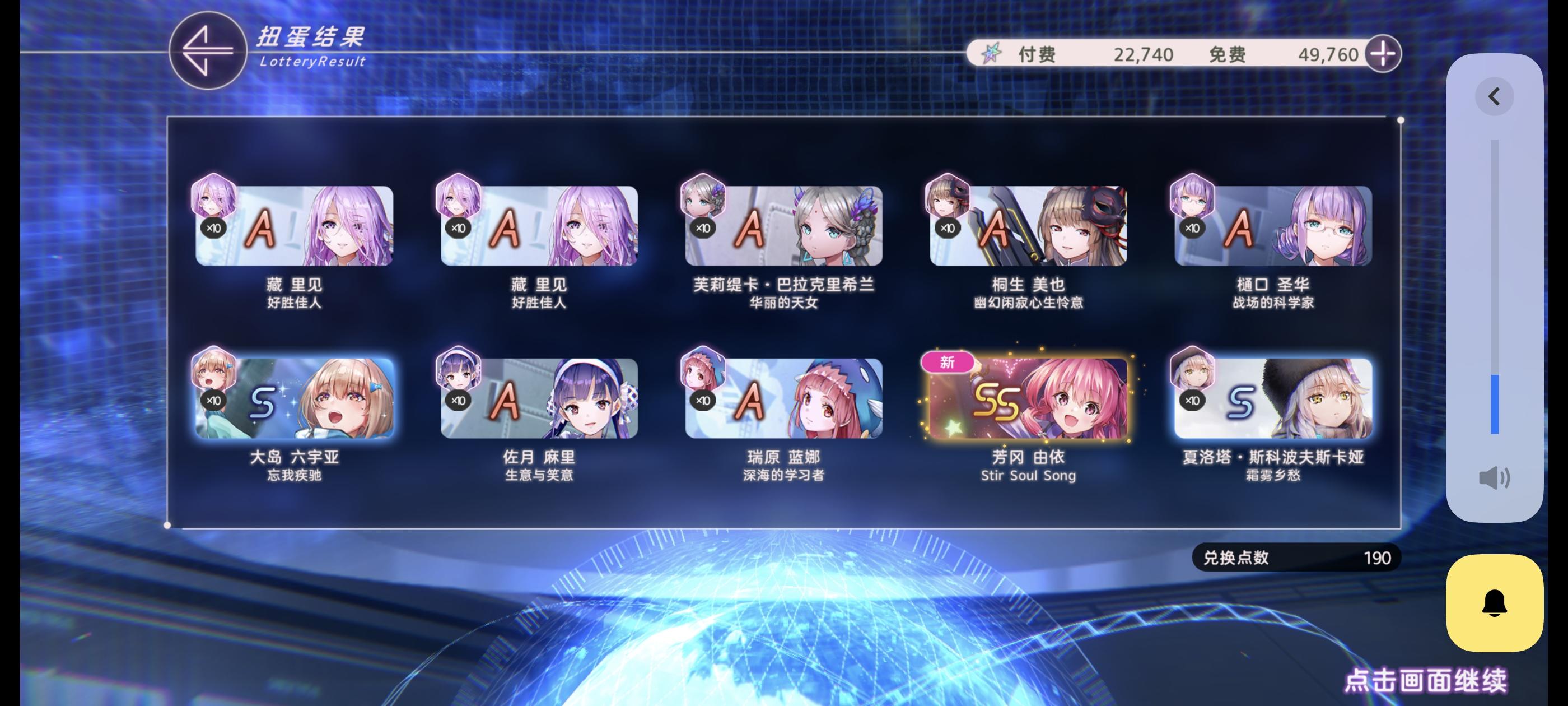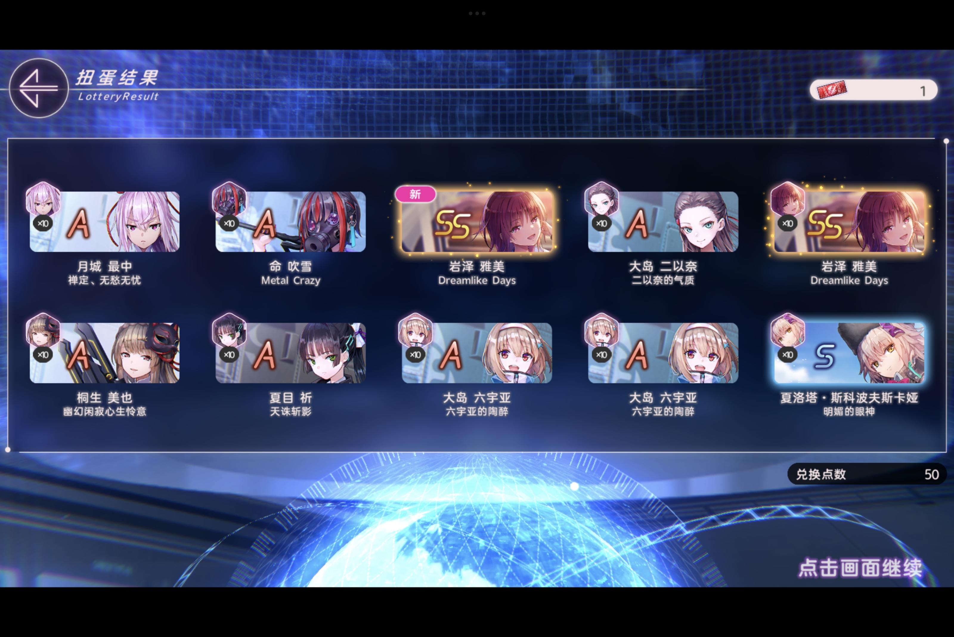 不好不坏吧,不用在奏和yui之间二选一了。出了我喜欢的yui喵,至少可以保底井一个奏了。中间歪了wow yeah。月卡10连出了原皮里沙。剩下的靠阶梯池赌下奏吧