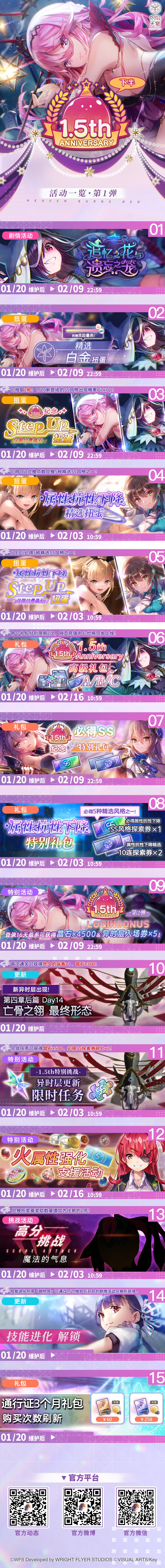 叮咚!1.5周年纪念下半・第1期活动一览已送达!本次将介绍1.5周年纪念下半活动【第1周】的活动内容~(●′ω`●)▶「1.5th纪念登录活动第2弹」开启!1/20 维护后,登录游戏16天最多可获得「晶石×4500」「异时层入场券×5」!▶全新剧情活动开幕!1/20维护后,将举办剧情活动「追忆之花与遗忘之笼」。通关主线剧情第二章即可解锁活动及对应活动棱镜战!▶「全新SS风格」登场!1