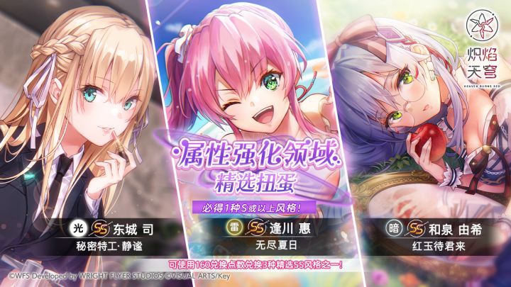 ▶属性强化领域精选扭蛋▌活动时间:2025/12/3 11:00 ~ 12/17 10:59▌抽取道具:晶石(付费或免费)、属性强化领域精选10连探索券▌扭蛋概要:●以下3种SS风格的出现概率将特别PickUp!SS和泉由希[红玉待君来]SS逢川惠[无尽夏日]SS东城司[秘密特工·静谧]●可使用160兑换点数,兑换上述3种精选SS风格之一!※本扭蛋的出现风格范围中,将不会出现默认